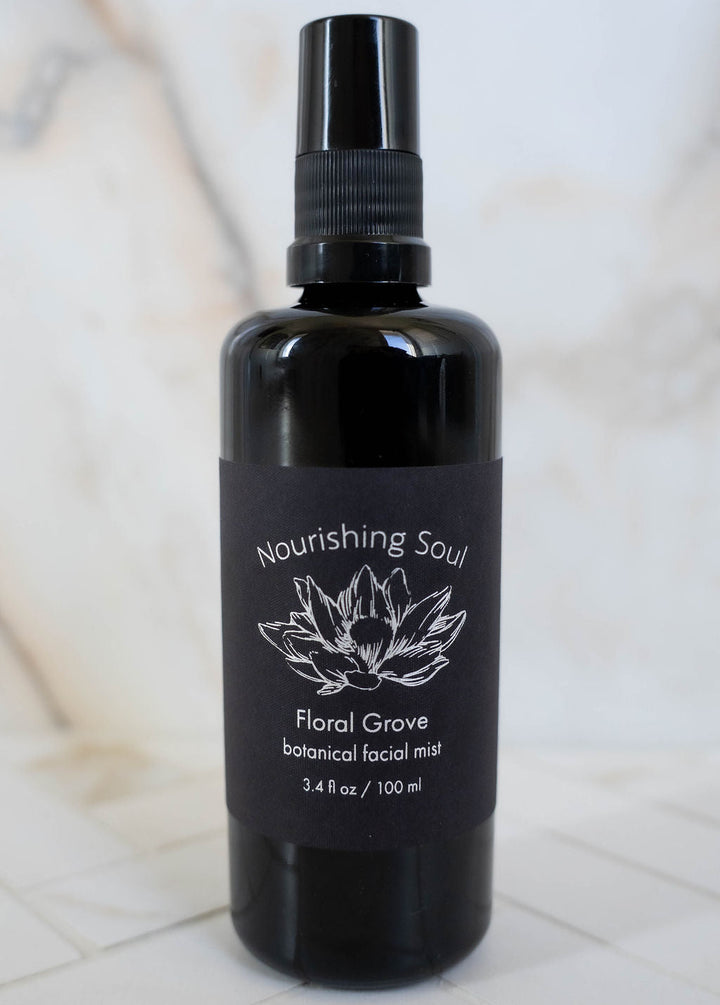 Floral Grove is a gentle, nourishing mix of flower hydrosols and plant derived glycerin designed to hydrate, soothe and tone the skin. This nutritional mist brings the skin to optimal ph balance as flower hydrosols naturally hold the same ph as our skin.